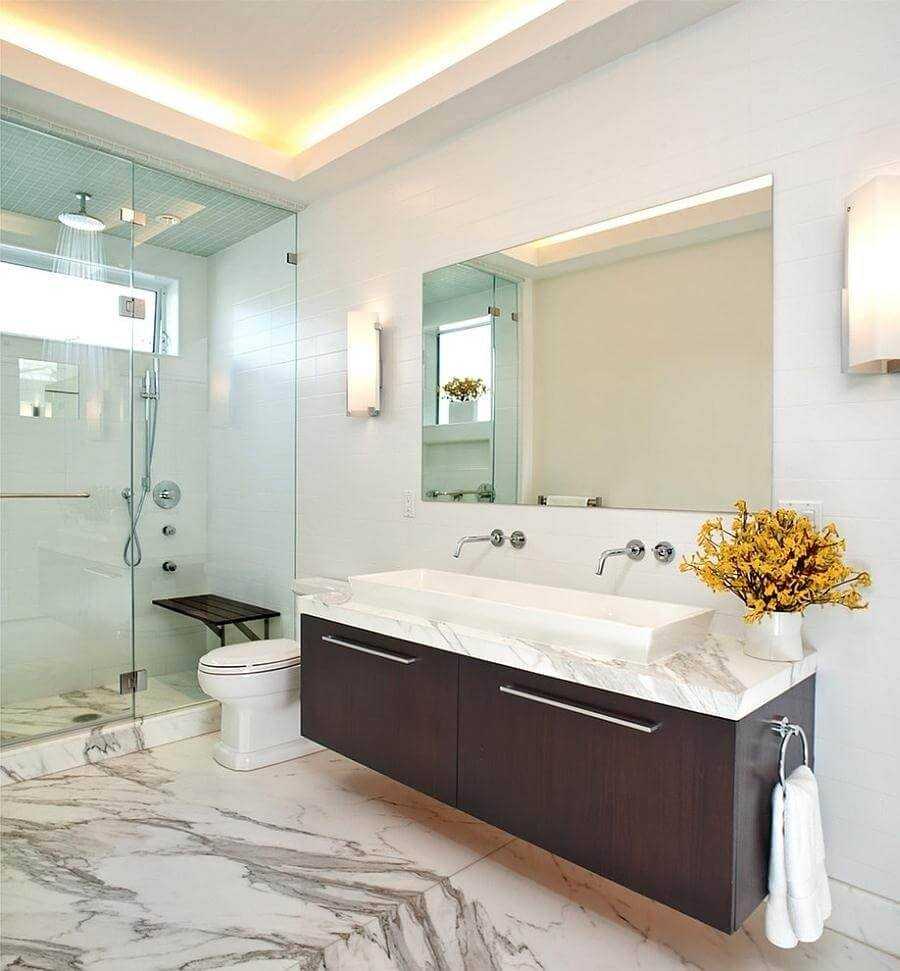 - При помощи установленной подсветки в потолок можно не только расширить помещение, но и устранить все тени. Так ванная будет казаться более объемной и просторной.