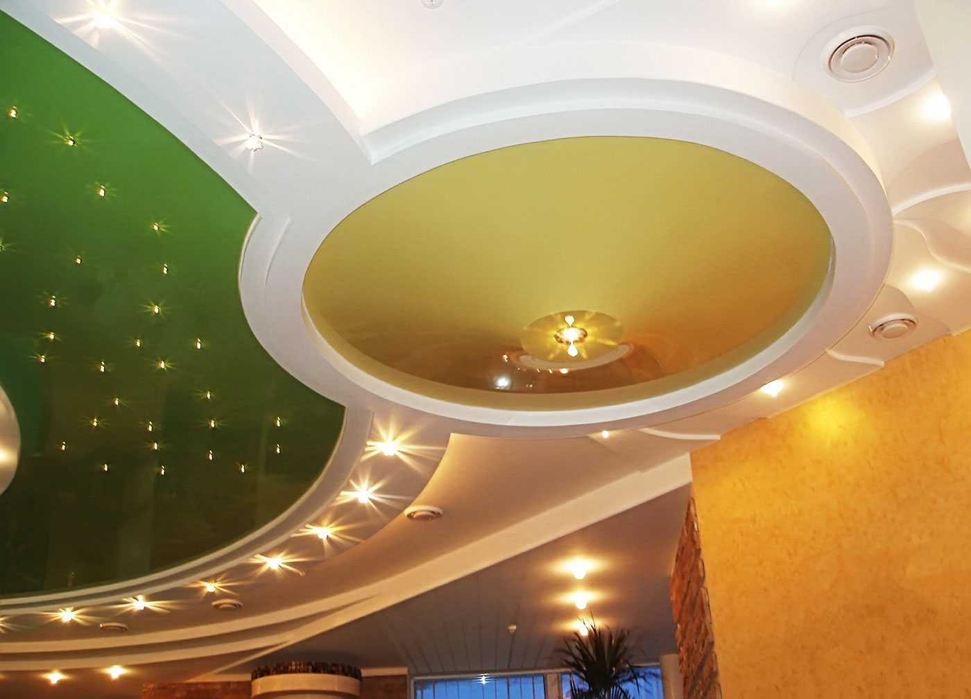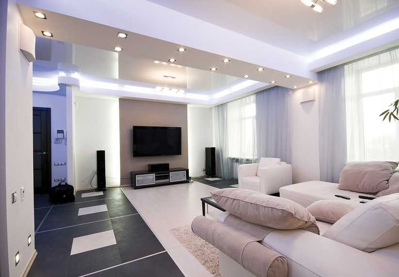 Используя разноуровневые конструкции со встроенным точечным освещением, можно создавать определенное настроение и визуально изменять объем пространства. При одновременном включении основных и дополнительных приборов создается атмосфера яркого солнечного дня. При использовании только дополнительного света получают уютную обстановку, располагающую к отдыху и беседе.