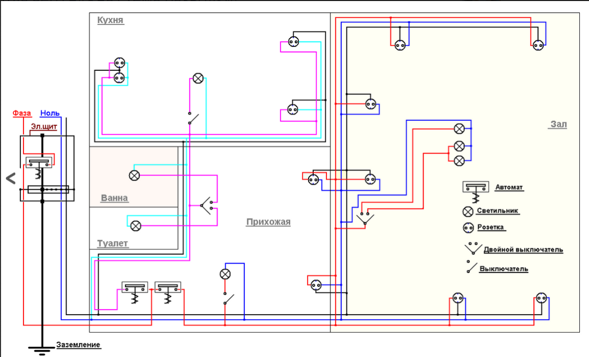 Это план (чертеж), где графически показано, где должно находиться определенное количество выключателей, розеток, осветительных приборов. Принципиальную схему разрабатывает каждый электрик, которому доверили работы. Однако разводка электропроводки может быть реализована и собственными силами. Главное правильно рассчитать планируемую нагрузку, а кабели разделить на группы. Система должна включать счетчик учета расхода электроэнергии. Также потребуются приборы защиты, заземление, если в многоквартирном доме это запроектировано изначально.