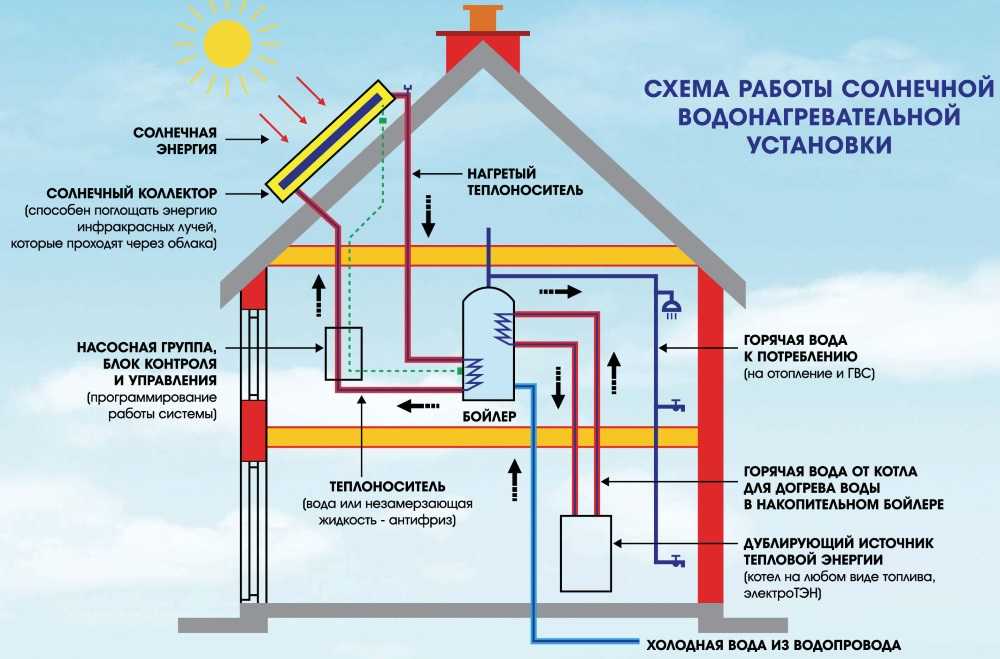 Схема устройства отопительной системы с солнечным коллектором, подключенным к бойлеру, и запасным источником электроэнергии (например, газовым котлом), работающем на традиционном топливе (+)