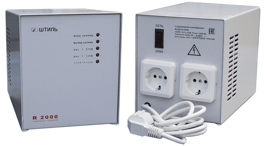Стабилизатор напряжения Штиль R2000 позволяет устранить эту проблему. Напряжение на выходе составляет 220 В с 5,5-процентной погрешностью. Величина входного вольтажа колеблется от 175 до 260 В, предельные значения 135-275 В. Если напряжение вышло за предельно допустимые параметры, устройство автоматически отключается. По возвращении вольтажа в допустимый диапазон срабатывает автоматизированное включение.
