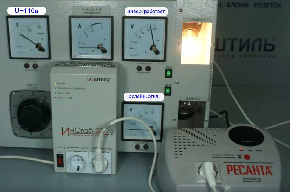 Хороший ролик наглядно показывающий разницу работы релейного и инверторного стабилизатора при резких скачках напряжения: