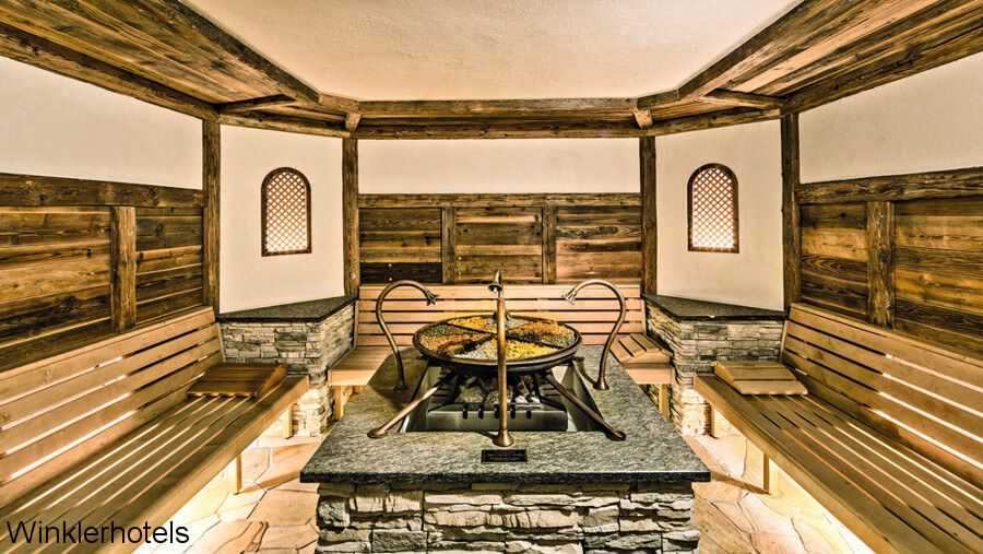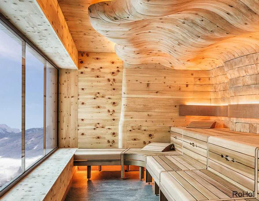 Для оформления просторной сауны отеля Lanerhof (Италия) выбрана скрытая фоновая подсветка, деликатно подчеркивающая фактуру натурального дерева, природного камня и полированного металла