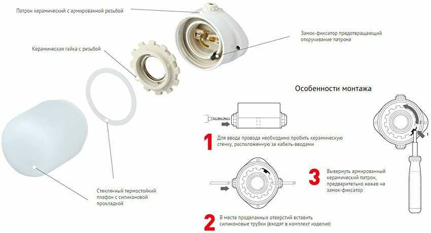 Схема монтажа термостойкого стеклянного светильника с керамическим патроном для сауны.