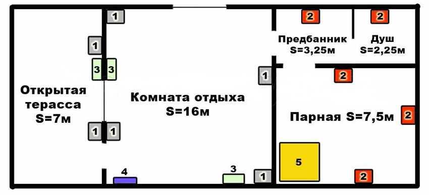 Пример электросхемы бани: 1 — светодиодные светильники, 2 — специальные термо- и влагозащитные светильники, 3 — розетки, 4 — электрощит, 5 — печь.