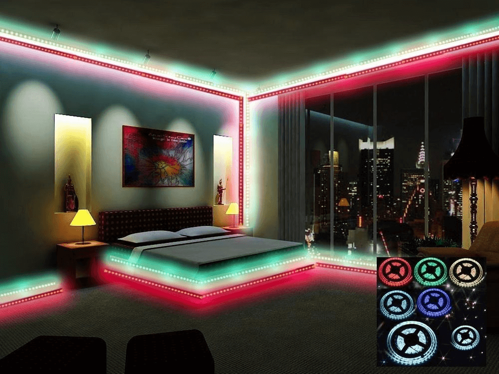 За последние годы высокую популярность приобрели светодиодные источники. Эти лампы потребляют минимум электроэнергии, эксплуатируются в точечных светильниках, люстрах, торшерах, бра. Еще одним не менее интересным и оригинальным вариантом является светодиодная лента. К гибкой плате припаиваются многочисленные led-диоды, изменяющие цвет излучения за счет RGB-технологии.