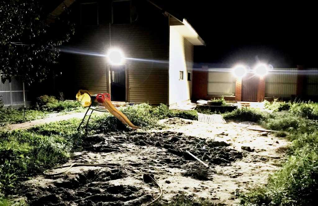 Светодиодные прожекторы также используются для подсветки территории возле дачи. Для этих целей стоит приобрести монохромный прибор, который светит холодным или теплым белым светом. Мощность выбирается в зависимости от габаритов территории – это может быть крылечко, участок перед входной дверью или вся территория