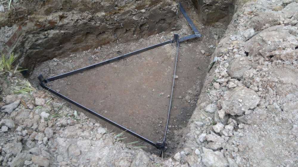 В крайних точках треугольника вбивают штыри (уголок или круглый пруток размером до 3 м). Над дном траншеи нужно оставить примерно 15 см