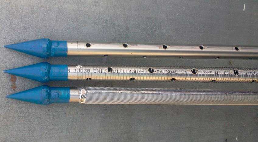 Фильтр абиссинской скважины: сверху — труба с отверстиями; в центре — труба с отверстиями и намоткой проволоки; снизу — труба с отверстиями, проволокой и сеткой.