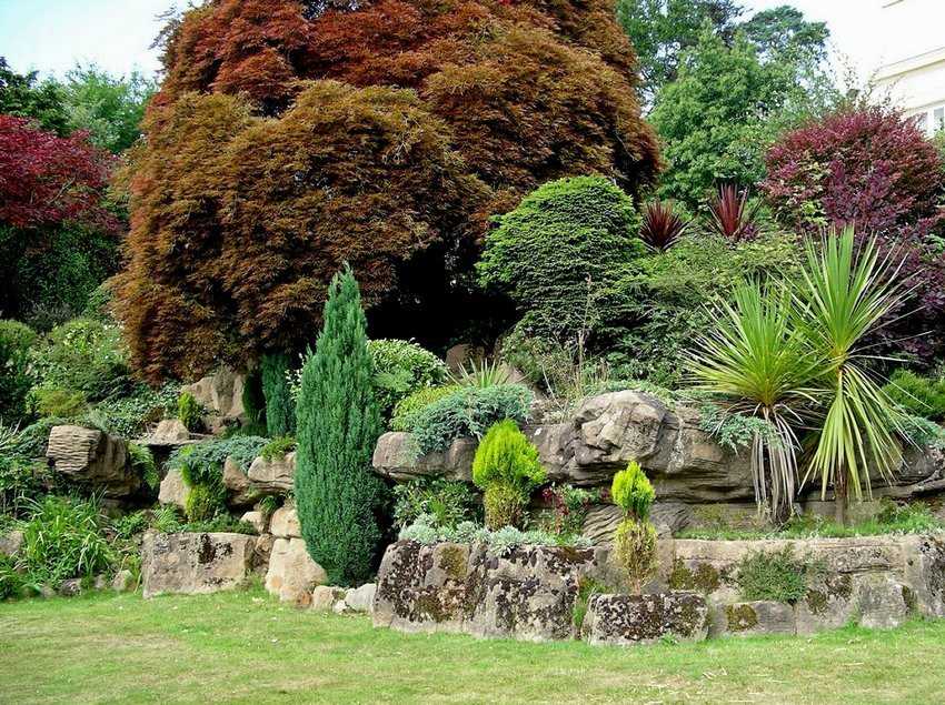 Для обустройства альпинария применяются не только хвойные, но и лиственные породы. Выбираются такие сорта, которые долго не сбрасывают листья, например: