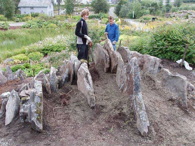 В качестве основы горки по её периметру выкладывают самые крупные валуны, причём каждый булыжник должен укрепляться в земле более, чем на половину своего объёма.