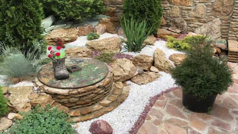 Если в качестве основы вы используете материал из покрышек, постарайтесь задекорировать эту основу так, чтобы ее не было заметно – глубоко вкопайте и закройте камнями, используйте монтажную пену и красители, оберните геотекстилем и присыпьте гравием;