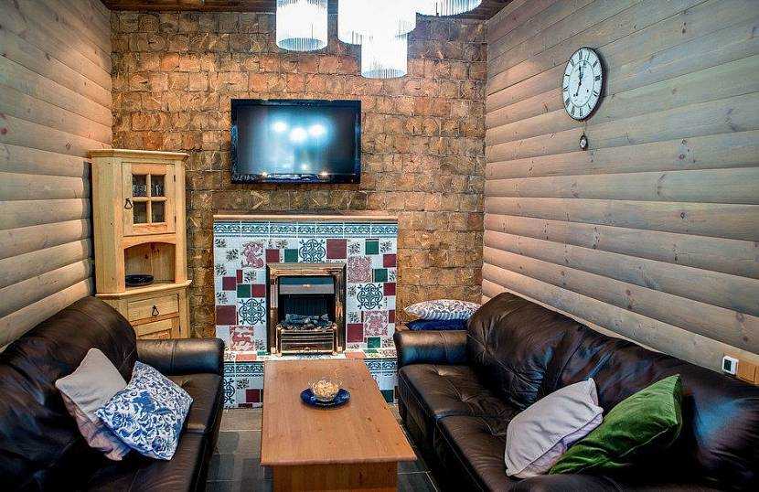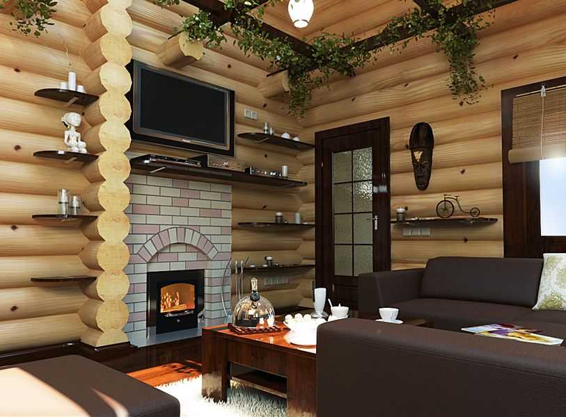 Если баня сделана из бревна или бруса, то основная задача по оформлению комнаты отдыха считается выполненной. Стены из натурального дерева красивы сами по себе и, как правило, не нуждаются дополнительной отделке. Дело остается за выбором удобной мебели, установкой техники и подбором подходящей посуди и аксессуаров.