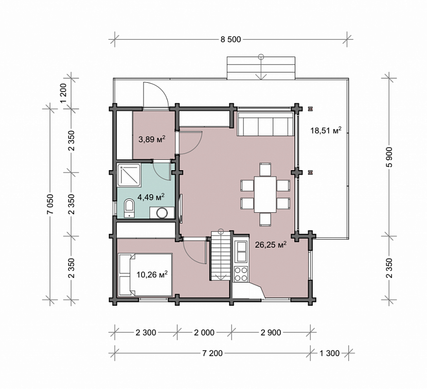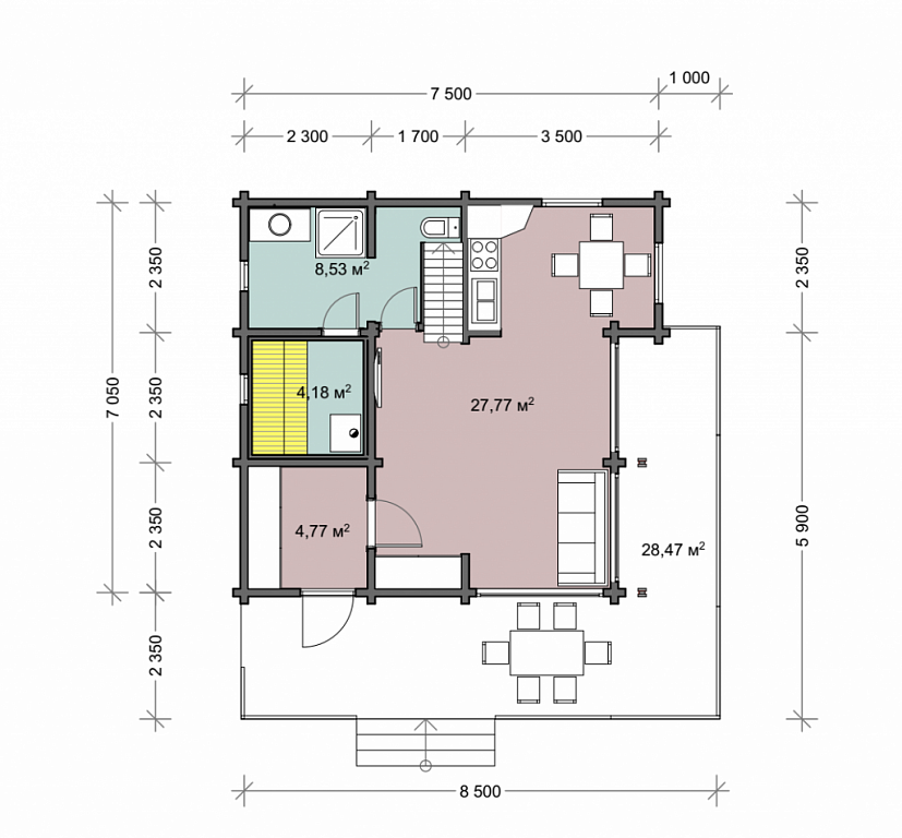 А вот как может меняться планировка первого этажа дома с баней размером 7050х7200 с пристроенной террасой: