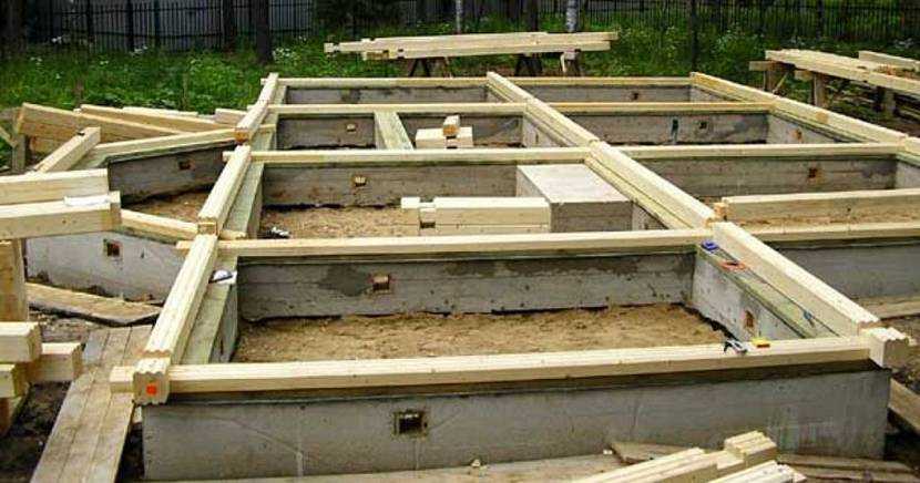Для более надежного соединения первого ряда в фундаменте предусматривают выступающие куски арматуры, к которым крепят основание. К основанию крепят лаги, на которые впоследствии укладывают черновой пол. При укладке лагов нужно отвести и обозначить место для печи и сливной ямы.