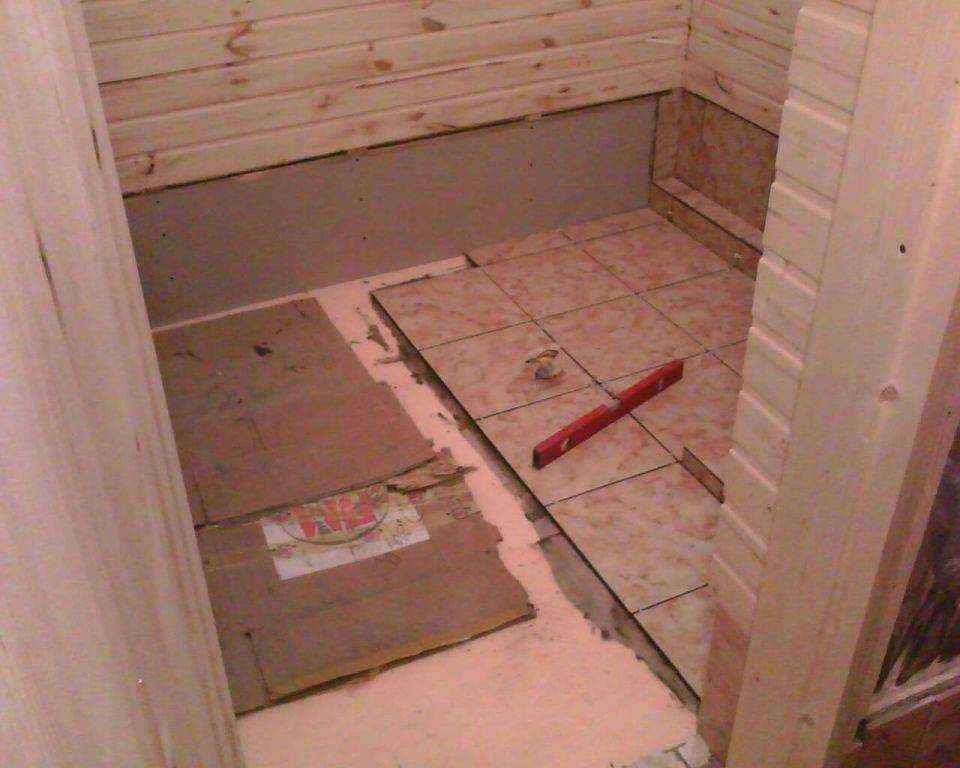 Для отделки пола лучше всего использовать керамическую плитку – она не сгниет через несколько лет, в отличие от деревянного настила. Для укладки кафеля достаточно предварительно выровнять пол с помощью стяжки.