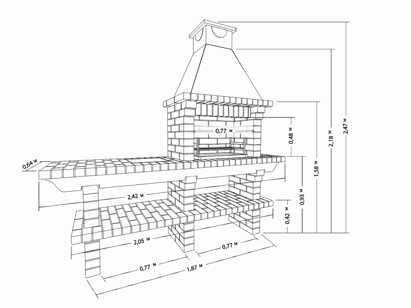 - кирпичный свод с дымоходом – для отвода дыма и защиты приготавливаемых продуктов от дождя. Кроме того, наличие свода и дымохода усиливает тягу, не дает жару от углей уходить бесцельно в стороны.