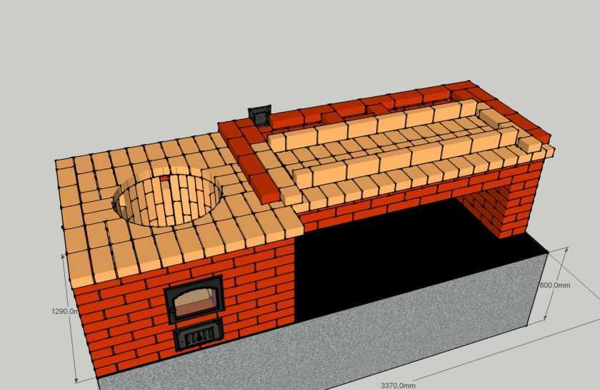 Кирпичные печи барбекю возводят на фундаменте или бетонном основании. Перед тем как начинать кладку, фундамент гидроизолируют с помощью двойного слоя рубероида. Для возведения конструкции такого типа потребуется примерно 1200 огнеупорных шамотных кирпичей. Кладут их на жароустойчивую смесь «Геркулес», выдерживая толщину шва в 5–7 мм.