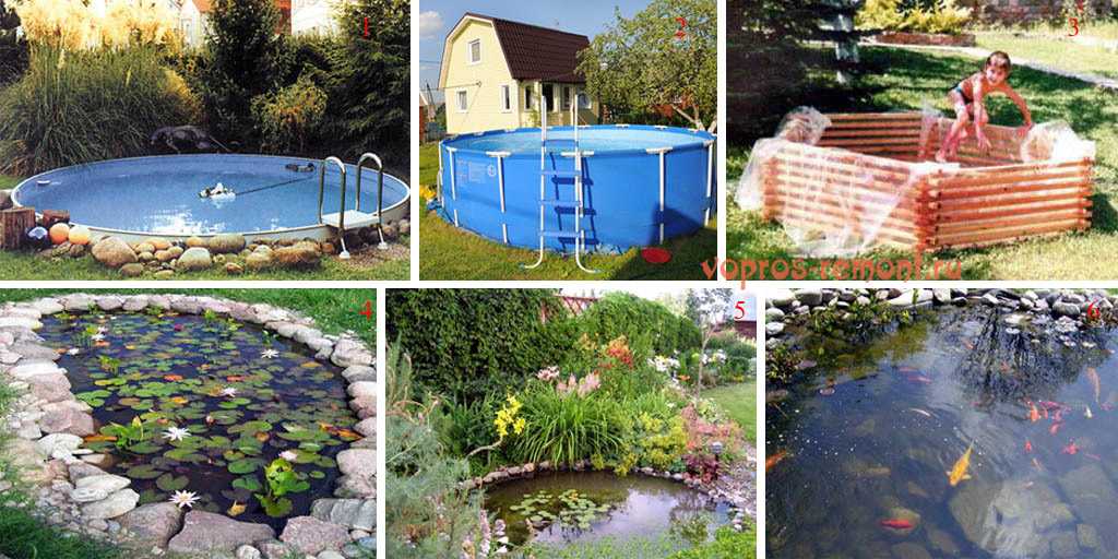 Итак, чего мы желаем? Постоянной емкости, в которой можно и поплескаться, и более-менее войти в ритм хотя бы по кругу тихим брасом (поз.1 на рис)? Временной купальни, которую по миновании надобности убирают в кладовку до следующего сезона (поз. 2)? «Лягушатника», дабы цветы жизни не превращались в раскисшую от жары скулящую крапиву (поз. 3)? Или уголок услады глаза; возможно, и рыбный (поз. 4-6)? Определившись, и поглядим, что нам лучше подойдет.