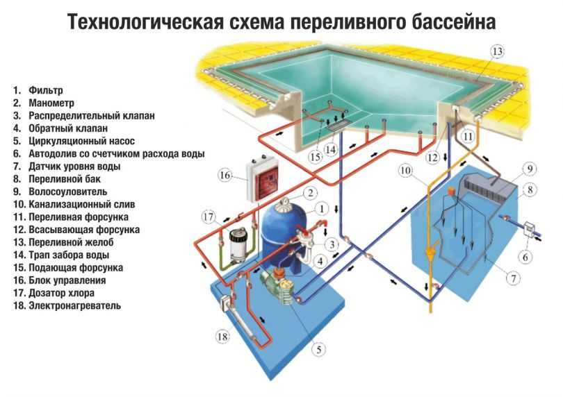 Переливная. Эта система позволяет наполнить чашу бассейна до самого края. Процесс очистки представляет собой непрерывный цикл сливания части воды, ее очистки и возврата обратно.