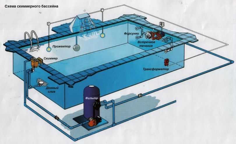 Скиммерная. Подходит для бассейнов не очень большого объема. Уровень воды всегда должен быть ниже верхней границы бортика на 15-20 сантиметров. Эта система проста в обслуживании, недорого стоит, но нужно понимать, что периодически бассейн будет требовать частичной смены воды.