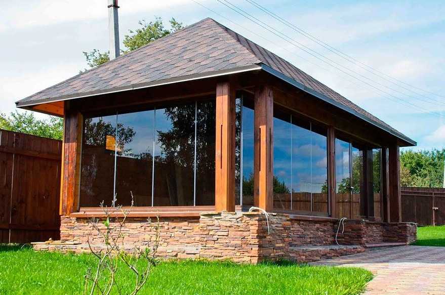 Каменные беседки относятся к категории бескаркасных конструкций. Их возводят на ленточном фундаменте. Обязательно поднимают стены или столбы, между которыми устанавливают окна и двери. В таких беседках сооружается капитальная крыша, подшивается утепленный потолок