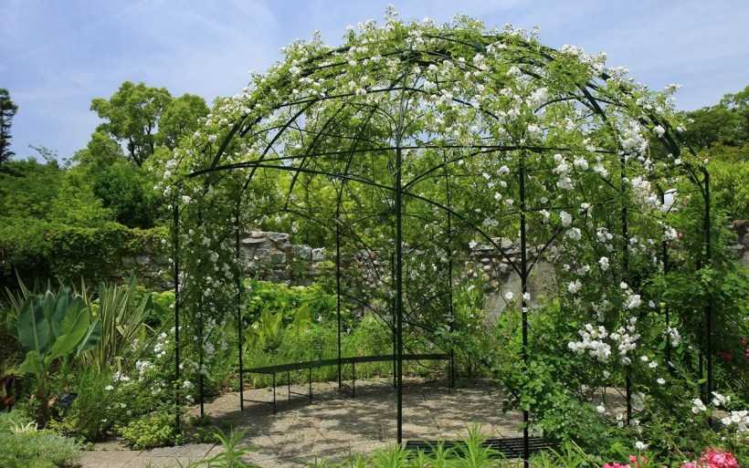- Еще один вариант хорошего сочетания с четырехугольной беседкой – полукруглая крыша. Стропила в таком случае приходится изготавливать из металла.
