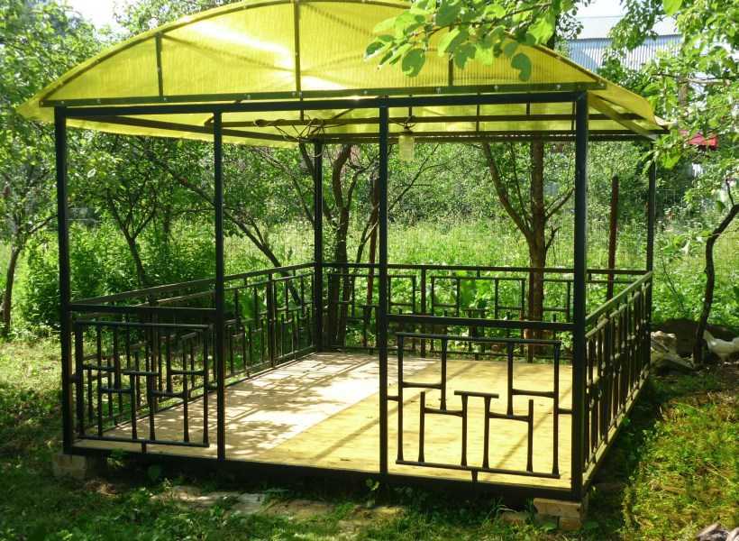 Отнести изделия из металла к бюджетному сегменту сложно, поскольку такие беседки чаще изготавливают на заказ. Кованые стойки, ограждения выглядят эффектно, но стоят дорого. Своими руками беседки для дачи из металла делают из типовых металлоконструкций. Декорируют сооружения готовыми модулями, в том числе коваными панелями.
