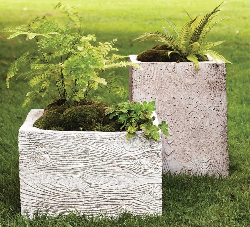 Положив бетон в деревянную коробку или толстую картонную коробку и погрузив в нее меньшую коробку, можно получить квадратные горшки. Чтобы бетон не промочил картон, на дно коробки можно положить тонкие доски. Коробку нужно застелить пленкой, смазать пленку маслом.
