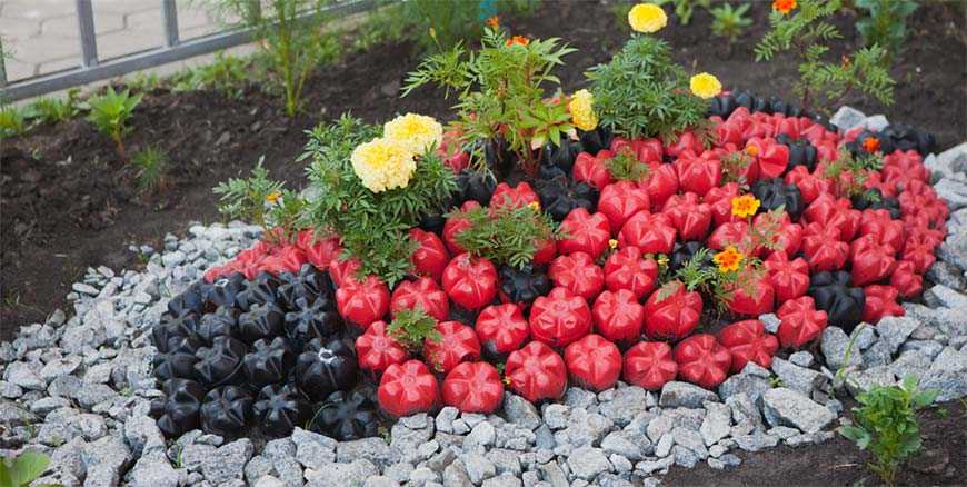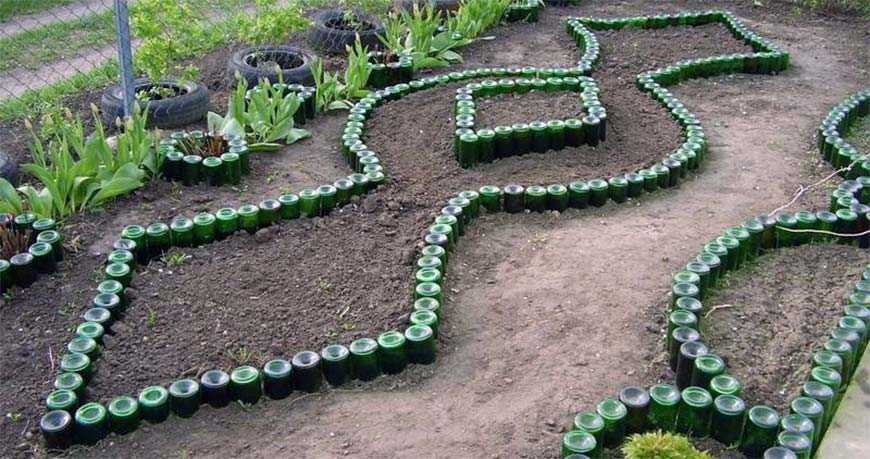 В качестве декоративного обрамления могут быть использованы стеклянные или пластиковые бутылки, бруски дерева, куски шифера, кирпичи, керамическая плитка и другие подручные материалы, которые могли остаться на участке после строительства или ремонта.