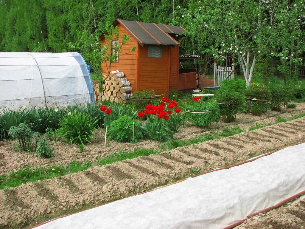 Под благоустройство садово-огородной зоны отводится самое большое количество соток земельного надела, около 2/3 участка. Сад-огород должен быть освещен, однако для высокорастущих деревьев с большой ветвистой кроной больше подойдет северная часть. От зоны отдыха, домовладения огород лучше отгородить рядом плодовых деревьев, с этой ролью прекрасно справляются карликовые яблони и вишни, цветущие они добавляют живописности всему саду. Для удобства огород разбивается на несколько отдельных грядок с помощью мощеных дорожек, так за всходами удобнее ухаживать. Под модульные грядки подводится система капельного орошения. Очертить овощные посадки можно из живой изгороди, сформированной из плодоносящих кустарников: крыжовника, смородины.