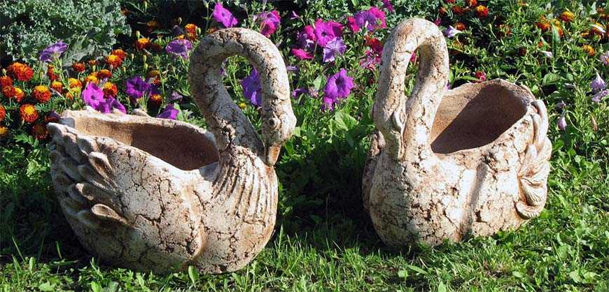 Одним из самых распространенных материалов для садового декора являются автомобильные шины. Из прочной и гибкой резины можно создать очаровательные вазоны, фигурки разных животных, песочницу, детские качели и пр.