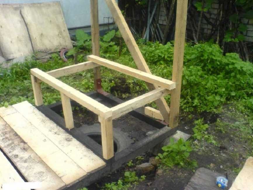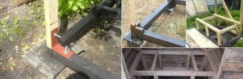 После обработки и высыхания брус скрепляют между собой поперечными перекладинами (внизу) и устанавливают полученную конструкцию на подготовленное основание над выгребной ямой. Следует учесть некоторые нюансы:
