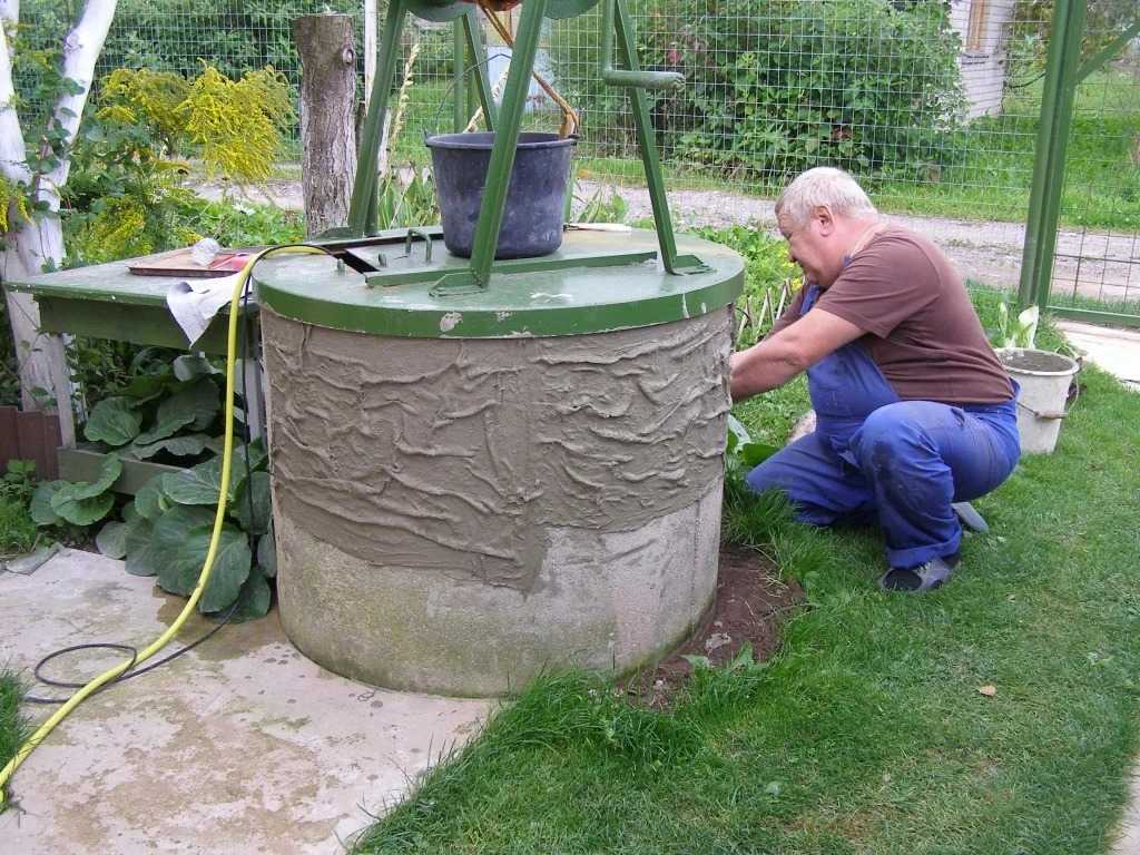 Первый материал используется на завершающем этапе отделки, если колодец был сооружен из бетонных колец, поверхность которых далека от идеала. Штукатурка и краска (зеленая) используются вместе в том случае, если бетонные стенки колодца планируют украсить не обычной отделкой, а растительностью.