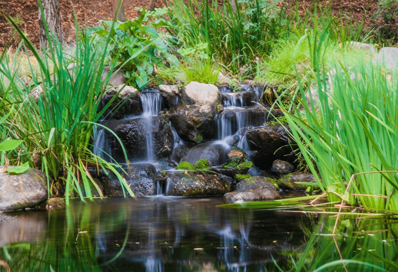 При самостоятельной организации пруда важно найти качественный насос. С его помощью можно будет создать пышный фонтан