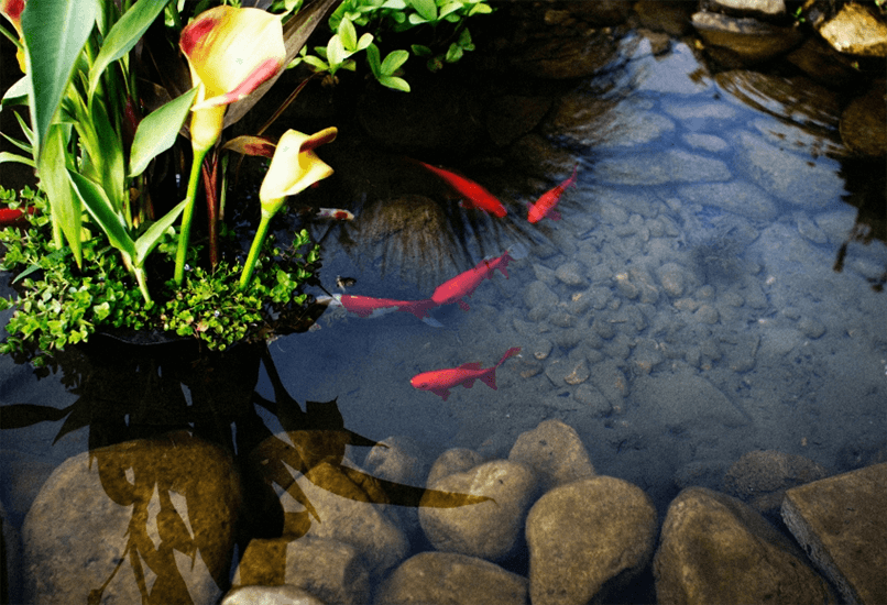 - Флора и фауна. Неплохой идеей является заселение водоема рыбами и водоплавающими насекомыми. Неплохо смотрятся растения как на суше, так и в воде.