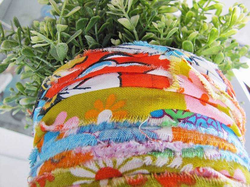 Еще один возможный материал – красивые кусочки ткани с набивными или напечатанными узорами. С напечатанными узорами на ткани техника работы мало отличается от бумажной, в то время как набивные узоры открывают большее пространство для воображения. Так, объемную вышивку можно закрасить вместе с горшком в единый цвет, наблюдая преображение пластикового горшка в предмет искусства со сложной фактурой.