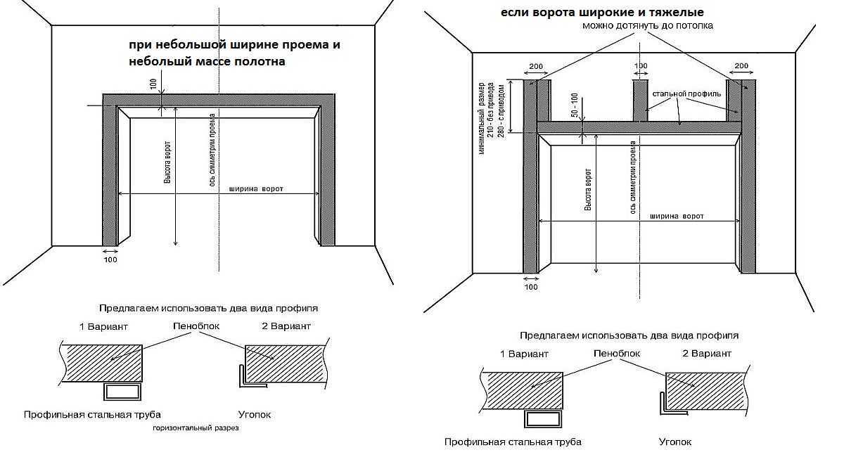 Самый удобный метод коррекции размеров проема ворот в том случае — приварить по периметру профилированную трубу требуемого сечения. Сечение выбирается так, чтобы было достаточно места и вверху, и по бокам. Еще вариант — сделать как на фото выше — сделать ворота не на всю ширину гаража.