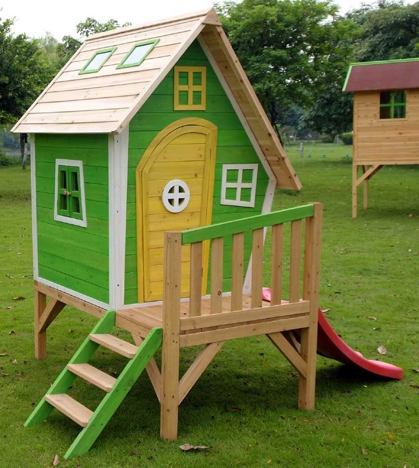 Для горки домик строится двухэтажный, либо установленный на опорных брусьях. Материала потратиться немного больше, чем для простого маленького домика для детворы.