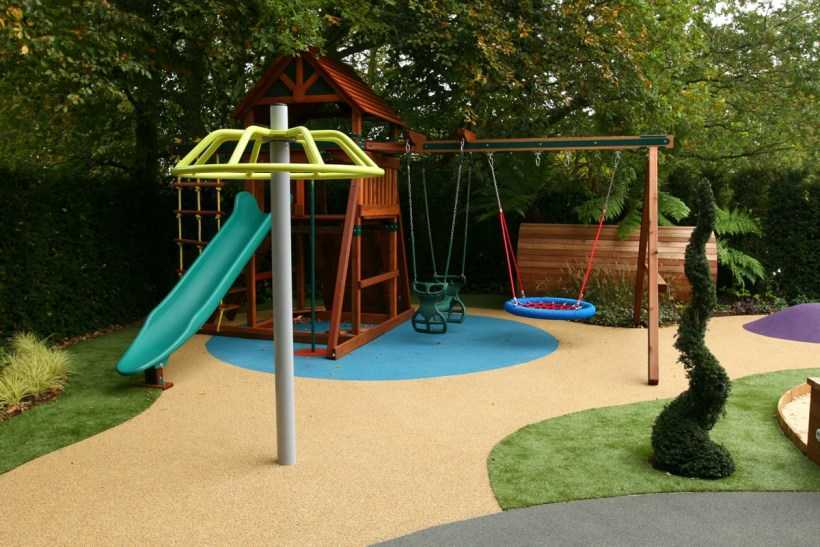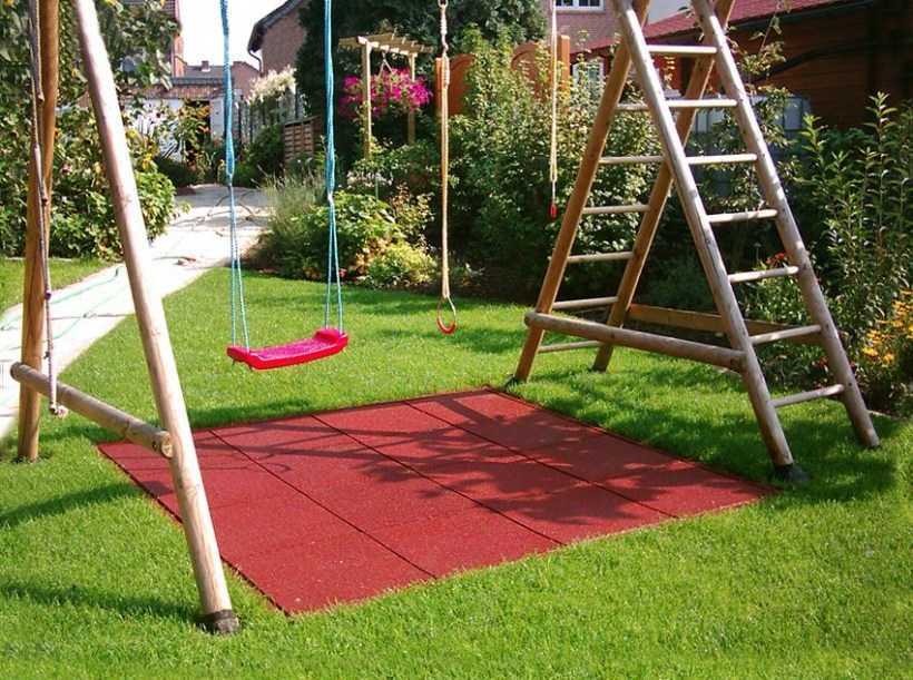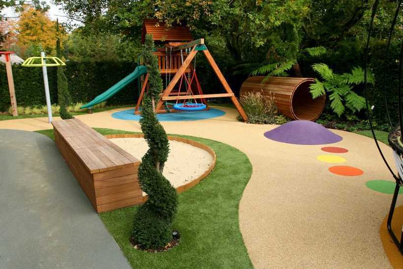 А если с бюджетом нет никаких проблем, то вместо газона и песочницы можно создать абсолютно безопасную подложку вроде регупола или резиновой крошки. Правда, прежде чем укладывать эти материалы, придется предварительно соблюсти дренажный слой.