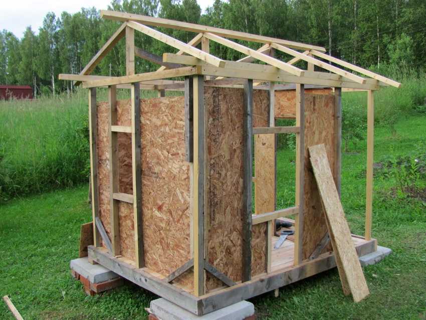 - Возведение стен. Готовый укрепленный каркас обшивают пиломатериалами. Для этого применяют широкие доски или плиты ДСП, которые сверху обшивают фанерой. При желании с помощью пенопласта производят внутреннее утепление стен.