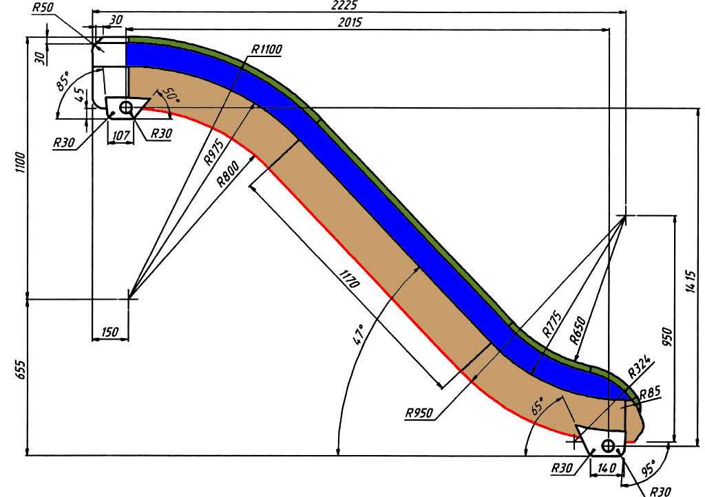 Однако, как сказано выше, пластика на детской площадке лучше избегать. Поэтому для достаточно умелых домашних мастеров даем на рис. слева профиль ската детской горки из листового металла. Красным выделена линия скольжения, коричневым – борта корытообразного желоба, синим – прямой защитный бортик с отгибом наружу; зеленым – упругая накладка на нем из гладкой резины. Последняя необходима, чтобы тормозить руками. Ширина желоба ската – 600-700 мм.