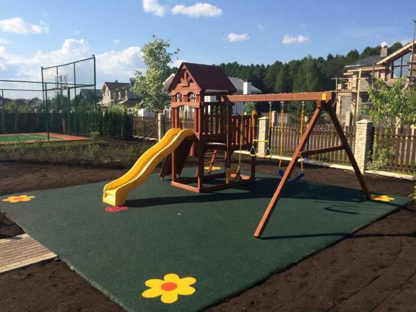 Как вариант, можно выполнить на площадке дренирующую щебневую подушку, разместив сверху покрытие из резины или песок. С резиновым покрытием все хорошо знакомы по стадионам – оно очень прочное и самое главное долговечное!