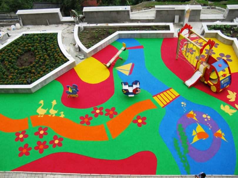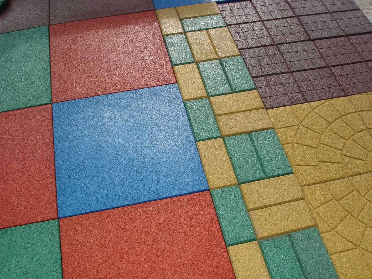 Резиновая плитка. Сравнительно новое покрытие для детских площадок. Оно имеет массу преимуществ. Смягчает падение, быстро сохнет после дождя, от него нет мусора, не пачкает одежду ребенка. Специально для игровых зон выпускают резиновую плитку ярких цветов и с детскими рисунками. Этот материал практичен и долговечен, плиточки можно выкладывать на любую поверхность и предварительно выровненный грунт.