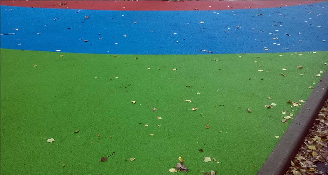 Наливное резиновое покрытие. Современный материал, в его составе резиновая крошка и полиуретан. Покрытие обладает всеми преимуществами резиновой плитки, но его достаточно сложно класть на подготовленной поверхности, поэтому для частной детской площадки на дачном участке такой материал используют нечасто.