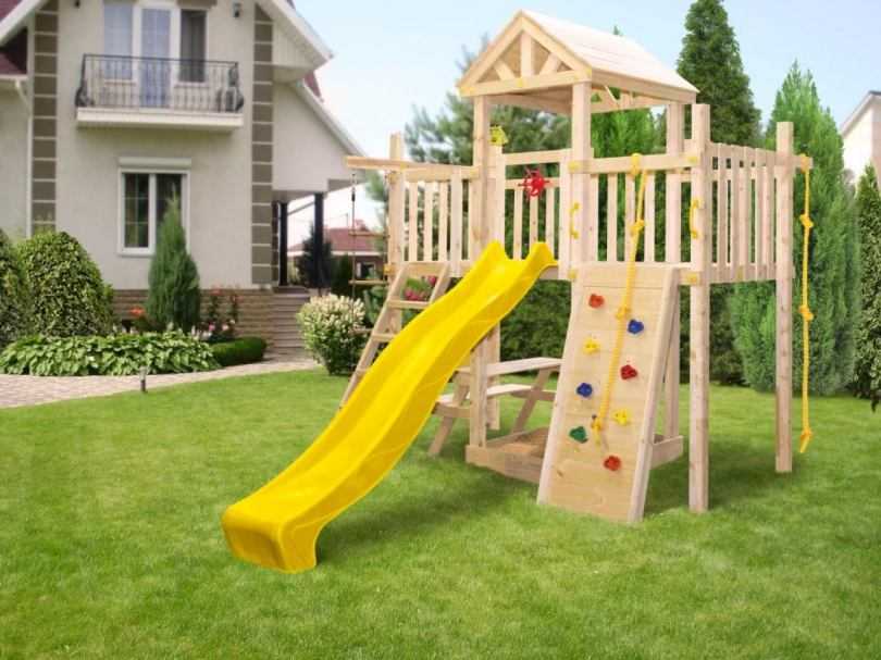 Деревянная горка с пластиковым скатомИсточник 1090983.ru