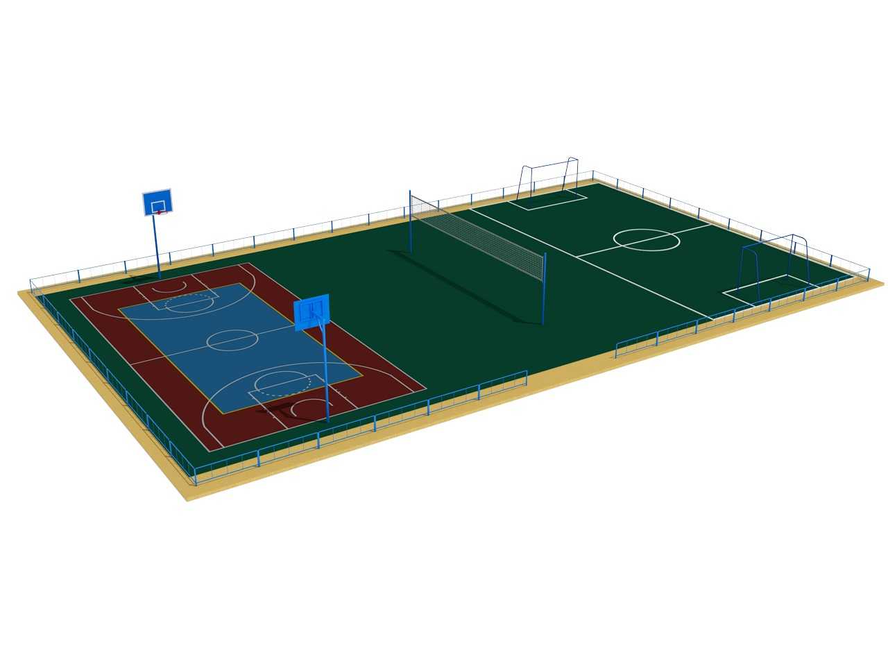 На данной площадке покрытие разграничивает 3 зоны: игровую зону, спортивную площадку, которая также огорожена забором, и беговую дорожку.