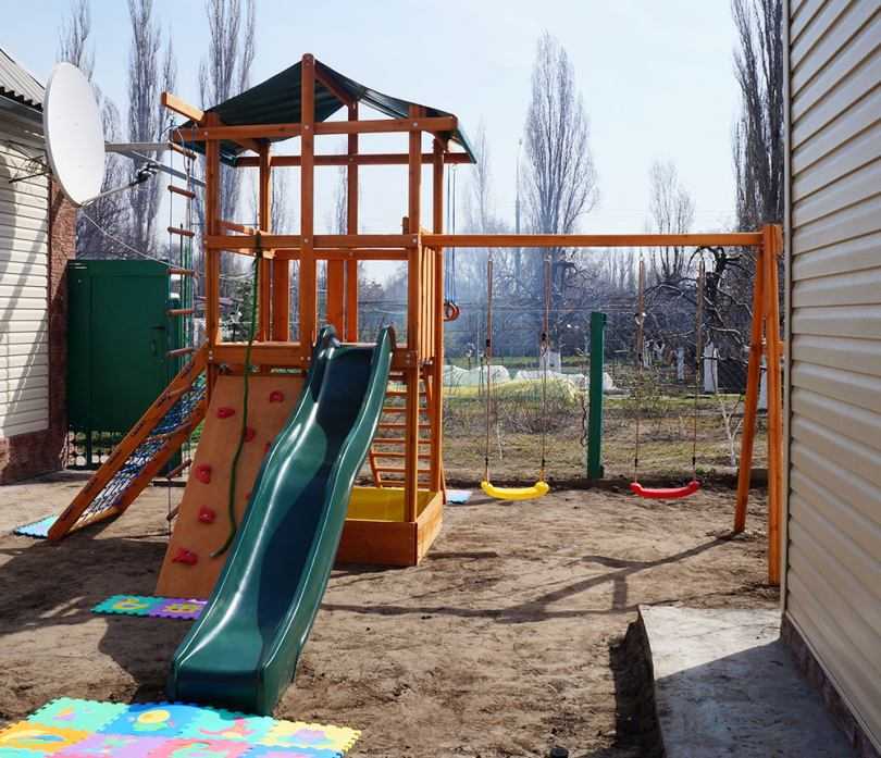Решить придется непростую задачу. Во-первых, желательно чтобы детская площадка просматривалась из дома, причем из помещения, в котором кто-то находится большую часть времени. Идеально, если площадка просматривается из нескольких комнат или точек. Во-вторых, располагаться она должна подальше от хозпостроек с «ароматами», если такие есть. В-третьих, желательно учесть плодородность почвы: под игровой комплекс можно выделить неплодородный участок или со сложной геологией: особо закапываться в землю нет нужды, максимум — на 30-40 см закопать столбы качелей.