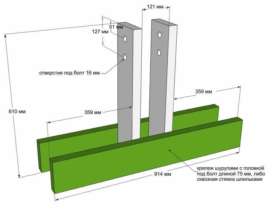 Мы будем использовать А-образные опоры, вкопанные и забетонированные. Для начала собираем опоры из бруса 100х50 мм.