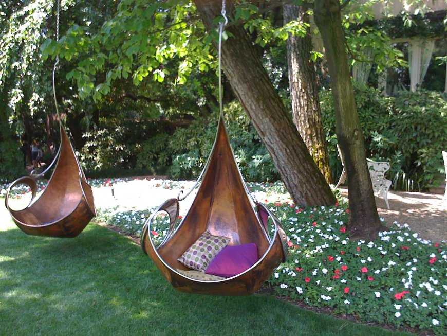 - Сфера или капля. Сферические или каплевидные качели относятся к категории подвесных и подвешиваются чаще всего с помощью одного троса или каната. Необычное сиденье плетут из ротанга или вымоченного дерева. Более экономный вариант – из пластика, ткани или веревки. Дизайнеры любят использовать такие стильные решения не только при оформлении внешнего ландшафта приусадебного участка, но и внутри помещений. В любом интерьере качели-сфера выглядят очень оригинально и уютно.